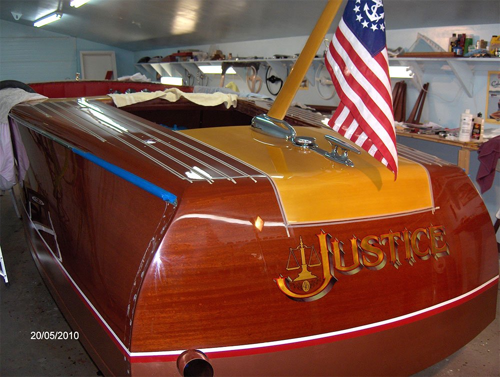 In 2006, Ben and Julie Wolf commissioned McCall Boat Works to restore the Custom 20 in remembrance of Julie’s father who was a circuit judge, thus Justice. Their goal was to take Justice to Lake Tahoe show.